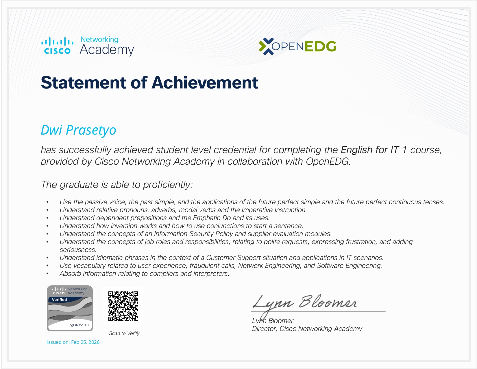 I am a creative, innovative, and detail-oriented individual with a strong interest in the field of information technology. I possess strong analytical thinking skills and am able to solve problems effectively, both independently and as part of a team.